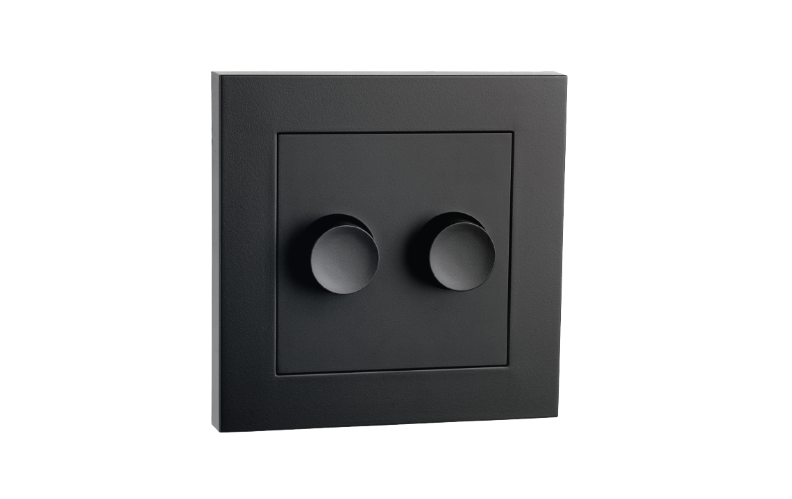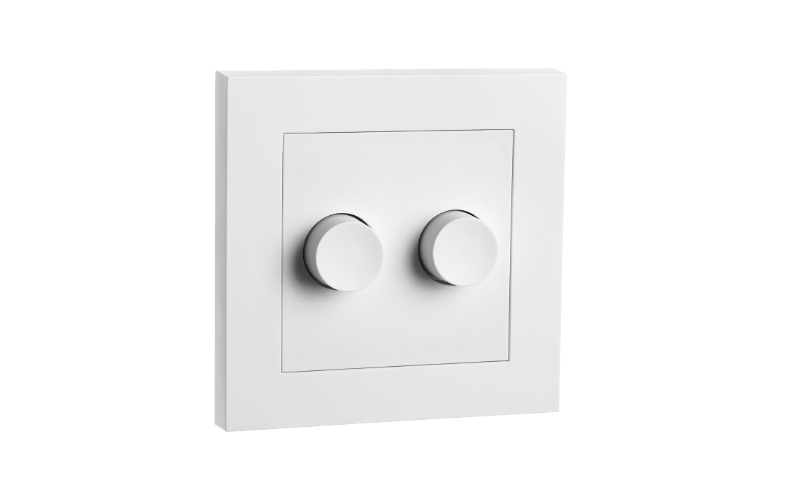 Der Phasenabschnittsdimmer LEDDim 2x100 sorgt für ein stabiles Dimmen des Lichts ohne angeschlossenen N-Leiter. Der Dimmer kann zwei Lasten steuern. Die Lichtstärken werden durch manuelles Einstellen der minimalen und maximalen Werte an die Leuchtmittel angepasst. Rahmen und Zentralscheibe als Zubehör auch in Schwarz erhältlich.