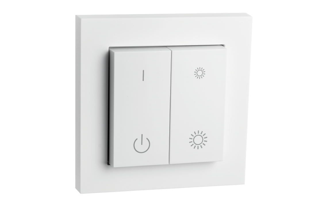 Der Schalter ermöglicht die manuelle Steuerung des Connect-Systems und ist sowohl mit einfacher als auch mit doppelter Wippe erhältlich. Mit der einfachen Wippe können Sie ein- und ausschalten oder auf- und abdimmen. Die Doppelwippe hat die gleichen Funktionen wie die einfache Wippe, ermöglicht aber zusätzlich die Aktivierung von 2 Stufen.