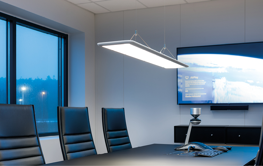 Dalle LED effilée suspendue au look contemporain. Luminaire en aluminium blanc mat. Le diffuseur prismatique permet un éclairage anti-éblouissant, direct et indirect. Idéal pour les bureaux et salles de réunion. La fixation au plafond est assurée par une patère qui permet à 2 câbles basse tension d’assurer l’alimentation. Cette dernière est donc invisible. Le dipswitch situé sur le driver permet de baisser l’intensité lumineuse au besoin. La patère permet également une installation dans les plafonds 600x600 en reposant sur les fers porteurs.