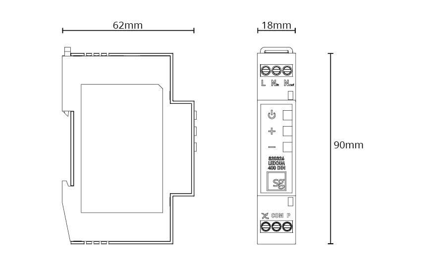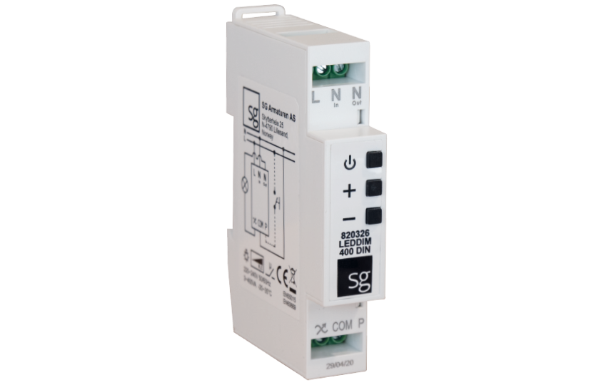 LEDDim DIN 2-pôles 400VA, Codes-articles: 820326, EAN: 7021988203262, IP20, Électrique: Wattage: 400VA, Puissance de veille: 0.36W, Tension: 220-240V, Protection surtension: Oui, Protection surcharge: Oui, Possibilité de définir le réglage minimum: Oui, Fonction mémoire en cas de coupure de courant: Oui, Convertisseurs: Type: Coupure de phase, Protection: IP Class: IP20, Matériaux et finition: Embase: Polycarbonate (PC), Montage/Connexion: Montage: DIN rail, Intérieur, Module: 2-pôles, Dimensions: Largeur (mm) W: 18, Hauteur (mm) H: 90, Profondeur\_(D): 62, Poids (kg) brutto/netto: 0.09 / 0.08, Emballage: Packaging dimensions (mm): 95 x 63 x 20