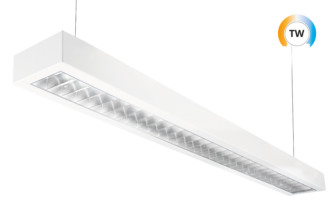 EcoLine Office is een geoptimaliseerd ledarmatuur voor kantoren en beschikbaar als opbouw- of pendelarmatuur. Dubbelparabolische reflector en diffusor. Plug-and-playoplossing voor een snelle installatie. Verstelbare kabelophanging (2 x 2 m) moet als accessoire worden besteld bij de directe versie. Met Tunable White (2700K - 6500K) DALI Type 8 sturing.