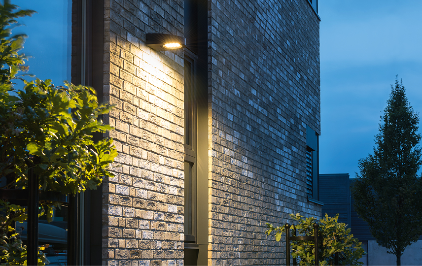 Asymmetrische LED-Leuchte für die Wandmontage. Vandalismusgeschützte, vielseitige Wandleuchte mit schlankem Profil mit asymmetrischer Lichtabstrahlung. Als Zubehör ist eine verstellbare Wand-/ Eckbefestigung erhältlich, die verschiedene kreative Lösungen für die Beleuchtung von Türen, Toren und Wegen bietet.