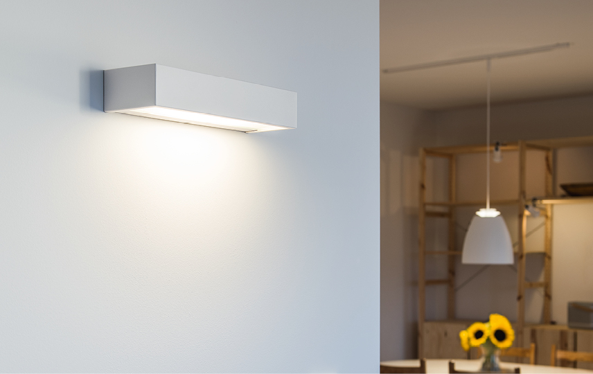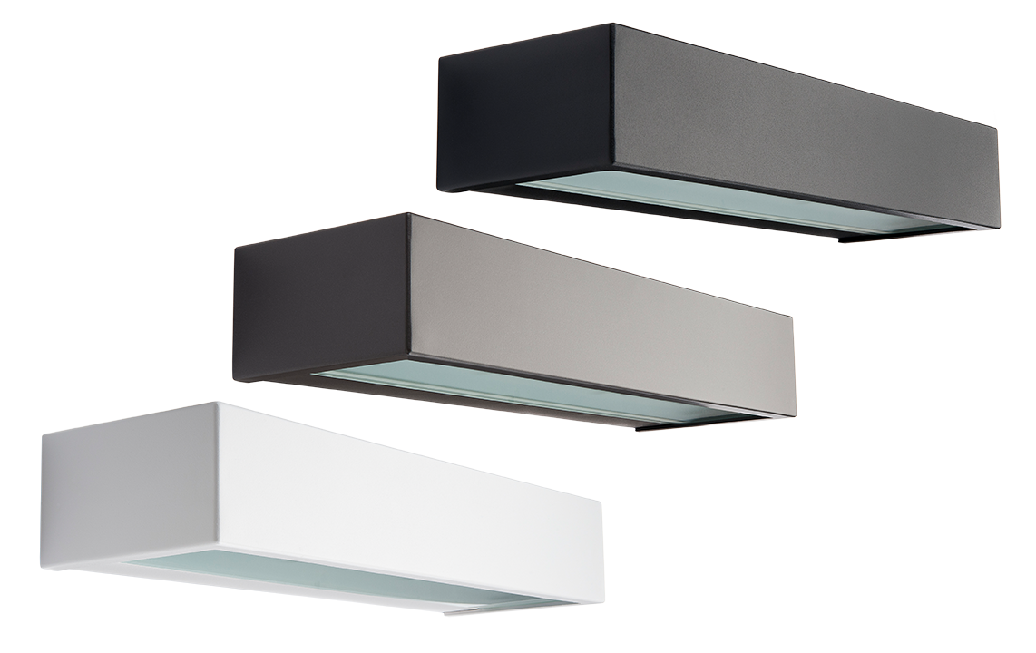 Attraktive, eckige Wandleuchte zur waagerechten/senkrechten Montage außen/innen. Versionen als Down-/Uplight oder mit nur einem Lichtaustritt, IP65, integrierte LED, Montagerückplatte mit 2 Kabeleinführungen, Möglichkeit für sichtbare oder verborgene Kabelführung, sowie Steckklemmen mit Möglichkeit zur Durchverdrahtung.