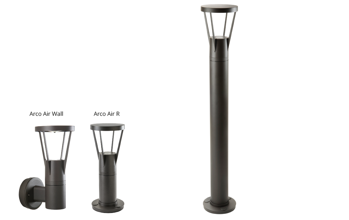 La gamme Arco Air a été conçue pour répondre aux exigences de l’habitat. En applique ou en borne (deux tailles) elle se voit équipée d’une source GU10 LED de 6,2W fournie, elle offre ainsi un éclairage doux, indirect et non éblouissant grâce à son réflecteur dans la tête du luminaire.Son raccordement est aisé en 230V sur bornier à connecteurs rapides et dimmable sur variateur coupure de phase. Son corps en fonte d’aluminium revêtu d’une poudre polyester lui concédera une excellente résistance à la corrosion. Quant à sa fixation, elle sera aisée soit a visser sur plot, soit à sceller dans du béton coulé avec son kit (accessoire).