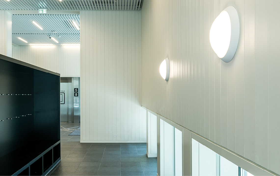 Design: Birger SevaldsonHublot rond en plusieurs dimensions. Protection contre le vandalisme avec opale en polycarbonate résistant aux chocs. L’ensemble du luminaire est homologué pour les voies d’accès communes, classe de protection contre le vandalisme IK10. Classe II, 2 entrées de câble et possibilité de repiquage par bornes intégrées. Montage sur mur ou plafond avec câblage caché ou visible. Nombre de luminaires uses variantes de sources lumineuses et détecteur, commandes sans fil et éclairage de secour. (BE)