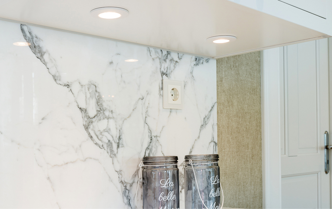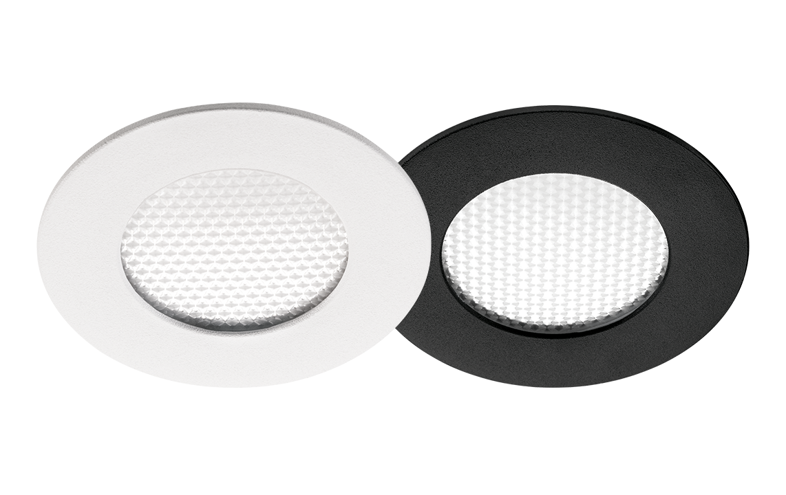 Faretto LED da incasso extrapiatto per piani di lavoro e nicchie interne. Fornito con 3 metri di cavo per un facile collegamento all'alimentazione (accessorio). Realizzato in fusione di alluminio.