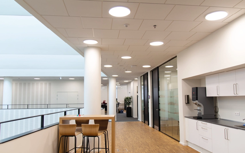 SG har leveret belysningen i form af over 1000 specielt designede indbygningsarmaturer. Armaturet er med LED 20W og 4000K med DALI. Det er rundt (Ø380) med opal afskærmning og en 20mm alu-ring. Selve armaturet er forsænket med 20mm i forhold til loftet.