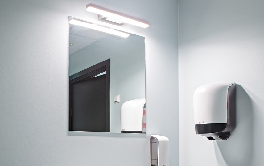 View er et moderne, slankt spejlarmatur i to forskellige længder til montering over et spejl på badeværelset. Monteringsbeslag til montering over et badeværelsesskab, spejlskab eller hylde fås som tilbehør.