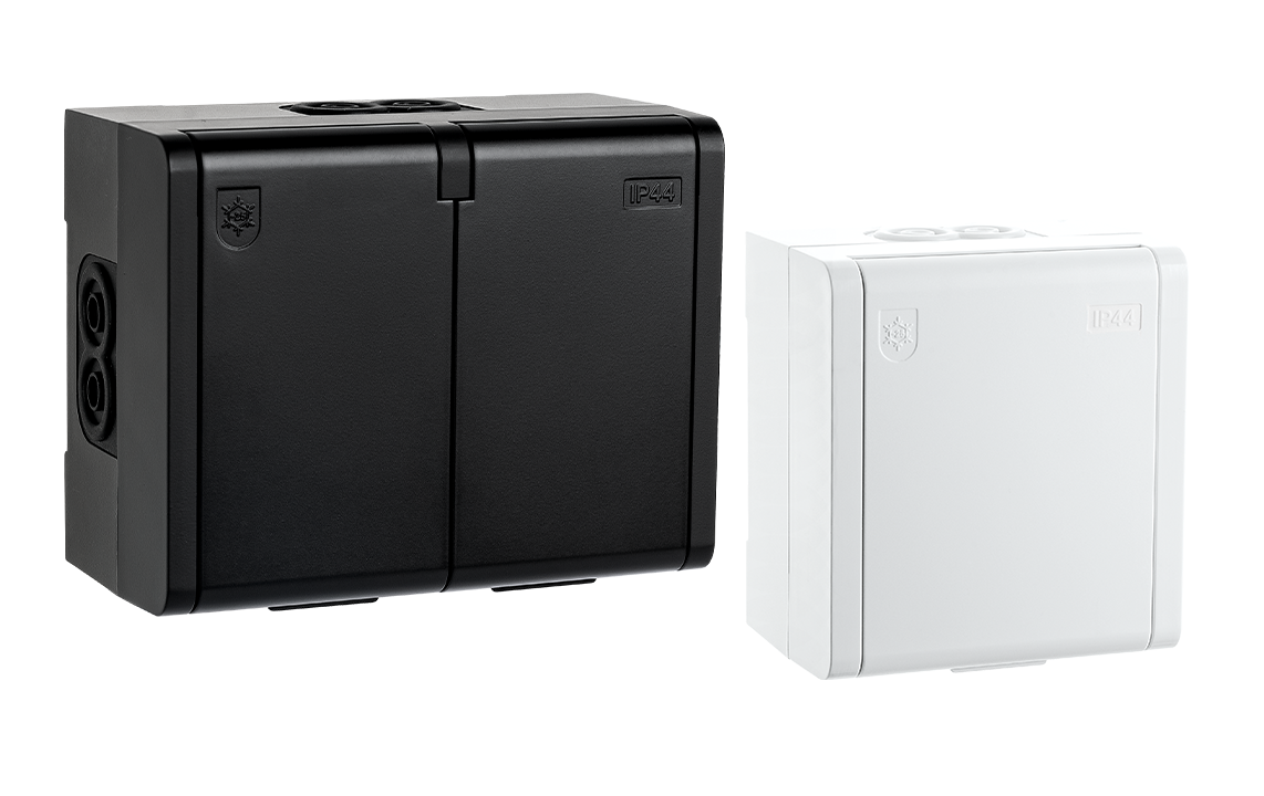 Revolutionerende nye åbne- og lukkeklemmer giver hurtig og effektiv montering. Stikkontakt påbygget udendørs IP44 har lukkeklap med strækfjeder, som sikrer beskyttelse imod regn, slud og sne.