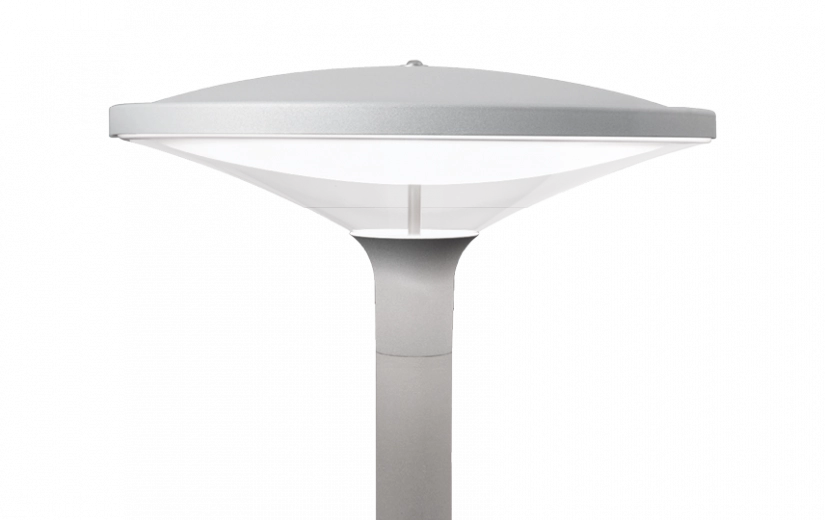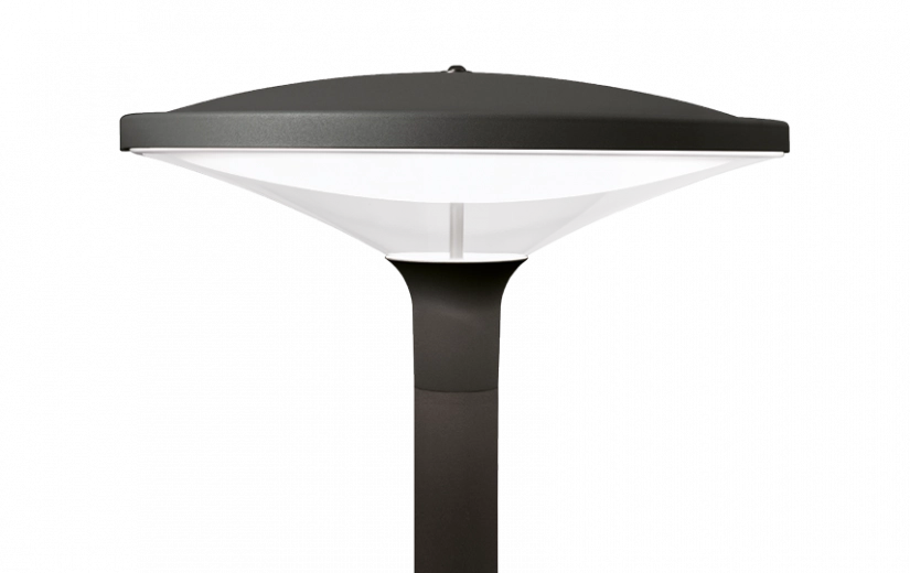 Design: Christian Hvidt. Rundt mast- eller vægmontert LED-armatur i unikt design som kombinerer visuell komfort med energieffektivitet. Base og top i trykstøbt aluminium i grå eller sort, indre skærm i opal PMMA, og ydre optik i polycarbonat. Komplet med LED driver til drift af LED lyskilder monteret på komponentskinne med intern stik/fatning og formonteret med tilslutningskabel (5m). Forberedt til montering på 60mm eller designmast. Beskyttelsesklasse IP66, vandalklasse IK10.