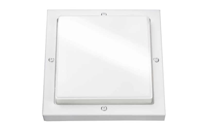 Design: Hallvard Jakobsen.Kvadratisk armatur som kan monteres på loft og væg både til inden- og udendørs brug. Armaturet er fremstillet af trykstøbt, pulverlakeret aluminium i hvid, sort eller grafit, med opal skærm i UV-stabiliseret polykarbonat. Den flade skærm giver mulighed for at påmontere tal og bogstaver, og dermed benytte armaturet som nummerskilt. Enkel montering med hurtigklemmer, to ind-/udgange for kabler, med mulighed for både skjult og synlig kabelføring. Beskyttelsesklasse IP65 og slagstyrke IK10.