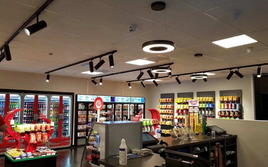 I indgangspartiet er der brugt Jupiter pro, og i kiosken er der installeret Tube on rails, Sense 60x60 og Circulus pendler. Sense round er brugt i lidt forskellige størrelser i offentlige områder, kombineret med Sense 60x60 som grundbelysning. Junistar er brugt i sluserne til biografsalene.