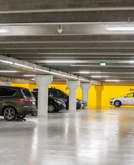 Løsninger er ca. 850 LED IP65 armaturer med lysfarve 4000K og med DALI. LED IP65 er leveret med transparent bund, der giver lidt oplys i parkeringskælderen, så den ikke virker så lav og mørk.