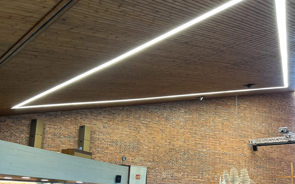 Belysningsarmaturerne er nu installeret, og alle parter er yderst tilfredse med slutresultatet. Projektet blev gennemført til tiden takket være et problemfrit samarbejde. Militærpræst Kivijärvi viser, hvordan belysningen fremhæver de fantastiske røde mursten og trækonstruktionerne. Lysstyrken er helt utrolig, siger han beundrende.