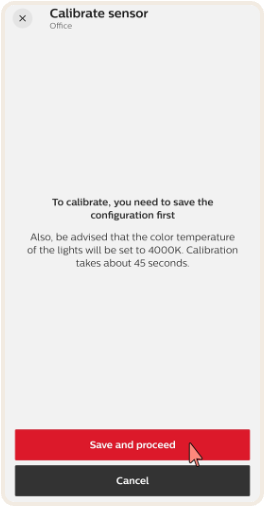 Når som helst efter konfiguration af Eco-on-niveauet skal der startes en kalibreringsrutine. Når kalibreringsrutinen køres, justeres lysniveauet til det fulde lysudbytte (givet af armaturets driftsstrøm) gange den procentvise værdi, der er indstillet for Eco-on-niveauet. Ved at justere armaturets driftsstrøm og Eco-on-niveauet i appen har brugeren fuld kontrol over det realiserede lysniveau på skrivebordet.