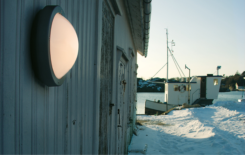 Hublot mural rond ou en plafonnier à montage en extérieur et en intérieur. Réalisé en fonte d’aluminium, poudre polyester. diffuseur en polycarbonate opale stabilisé aux UV. 2 passe-câbles, possibilité de câblage arrière ou latéral et connecteur rapide repiquable. Variantes avec détecteur ou détecteur crépusculaire intégré. Design: Hallvard Jakobsen.