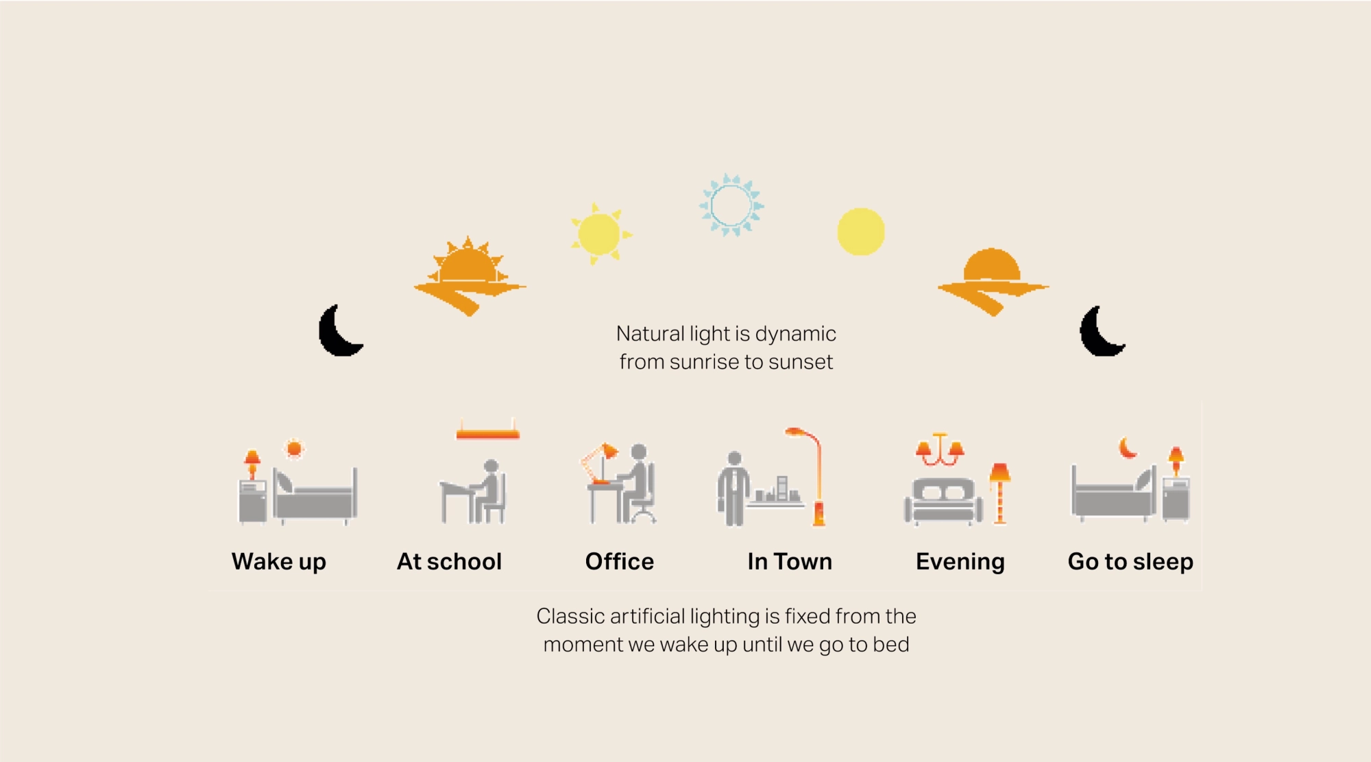 Many people are spending more than 90% of their lives indoor. Traditional artificial light is fixed from the moment we wake up in the morning at home until we go to bed. It doesn't reflect the intensity, timing, colour and dynamics of natural light.