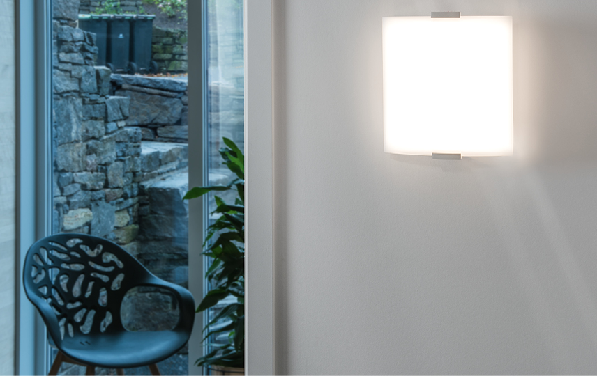 Elegant luminaire with curved shade for wall mounting. With a large LED disc it provides a uniform, soft light. Simple, tool-free installation with pop-up LED plate and the option of concealed and visible cabling. The driver has a dipswitch, so you can set the desired light level. It is also dimmable with phase cut.