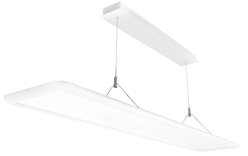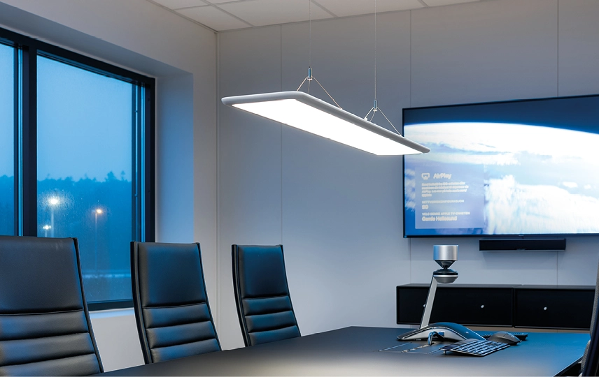 Sense Air has a thin, slimmed profile which gives an illusory floating effect in the room. The frame comes in matte white powder-coated aluminium. The Prisma diffuser creates a dazzle-free illumination and is a perfect luminaire for offices and conference rooms. The ceiling mount allows for surface-mounted fitting with either hidden or visible cabling. It is also possible to insert the ceiling mount in standard 600 × 600 inner ceilings. The low voltage current in the wires from the ceiling mount allows for an elegant solution without any visible electrical cables. The DIP switch on the driver means that the light level can be adjusted if necessary. Available with optional emergency lighting.