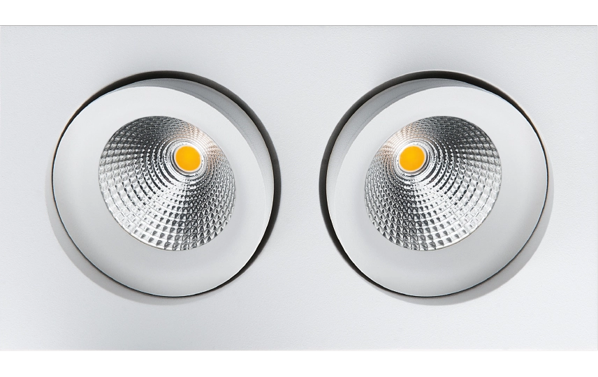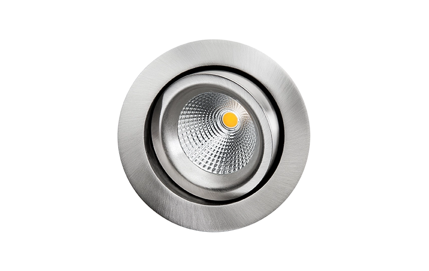 Attractive downlight for indoor use with 30-degree 360-degree stepless tilt. Well integrated LED chip and dimmable Phase cut-off or DALI driver. Made of die-cast powder-coated aluminium or brushed steel, glass diffuser. 42-degree beam angle angle via reflector. Low recessed downlight with hole size Ø83mm. Tool-free mounting in mounting box for direct 230V with loopable quick clips and automatic strain relief. IP44, KL III with dedicated circuit.
