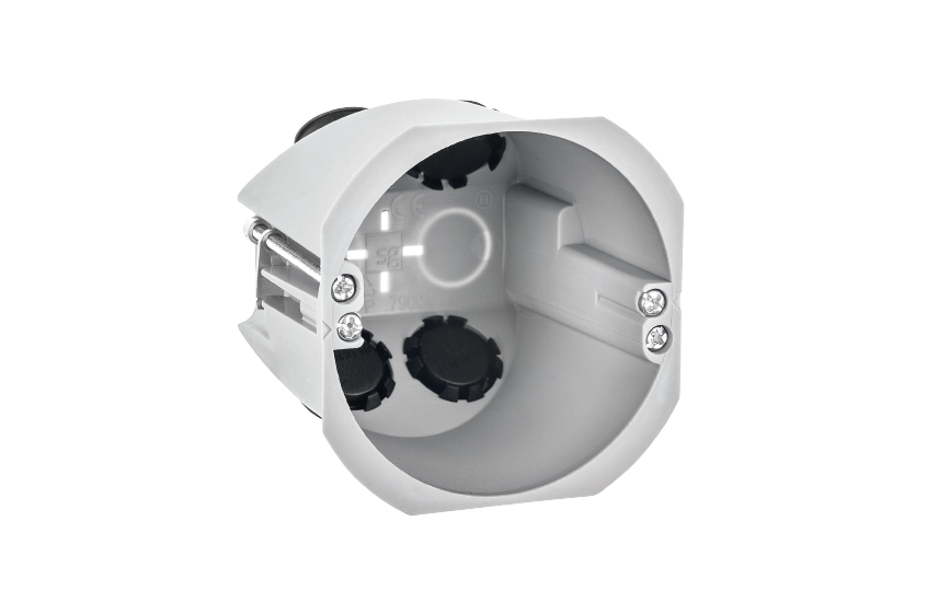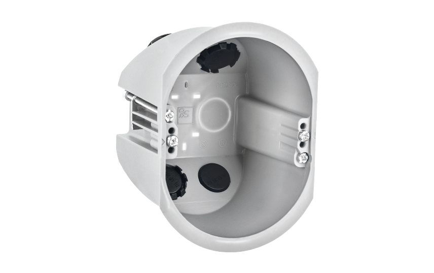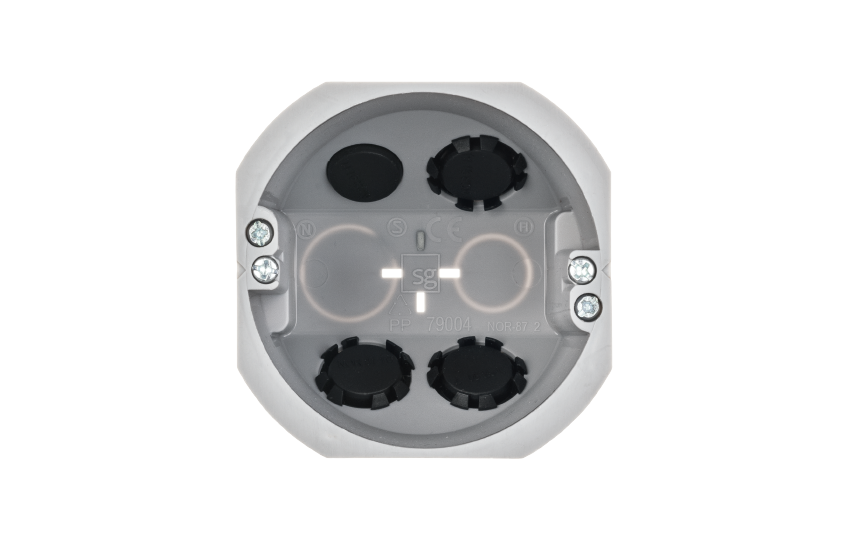 Wall boxes, rehab/multi-boxes for mounting from the front in existing walls. Flexible solution with four 16 mm pipe insertions that can be easily removed to fit 20 mm pipes. Solid, halogen-free PP plastic. Integrated marking for easy hole drilling. White or black covers in non-fade polycarbonate.