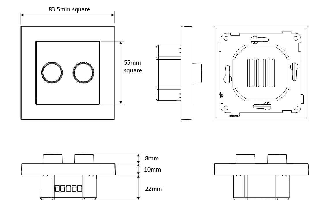 LEDDim White 2x100 2x100VA, Article code: 820473, EAN: 7021988204733, IP20, Function: Function: Including dimmer, 2 pcs. white knob, 2 pcs. nut, white outer frame and white inner frame, Electrical: Wattage: 2x100VA, Voltage: 220-240V, Frequency (Hz): 50/60Hz, Overvoltage protection: Yes, Overload protection: Yes, Minium dim level is adjustable: Yes, Memory feature in the event of voltage drop out: Yes, Protection: IP Class: IP20, Materials and finish: Housing: Polycarbonat (PC), Colour: White (RAL 9003), Mounting/Connection: Mounting: Recessed, Indoor, Dimensions: Length (mm) L: 84, Width (mm) W: 84, Height (mm) H: 42, Weight (kg) gross/net: 0.118 / 0.093, Packaging: Packaging dimensions (mm): 90 x 50 x 90