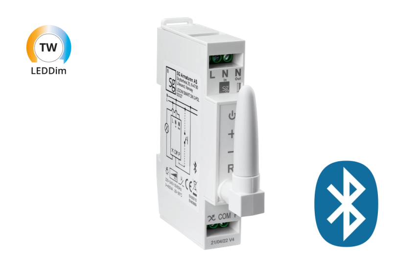 Bluetooth-controlled digital phase control dimmer for installation on DIN rail. Adjustable aerial to ensure good Bluetooth connection. Potential for control using pulse switch, either 230V or 24V.