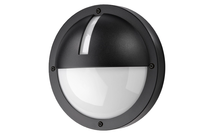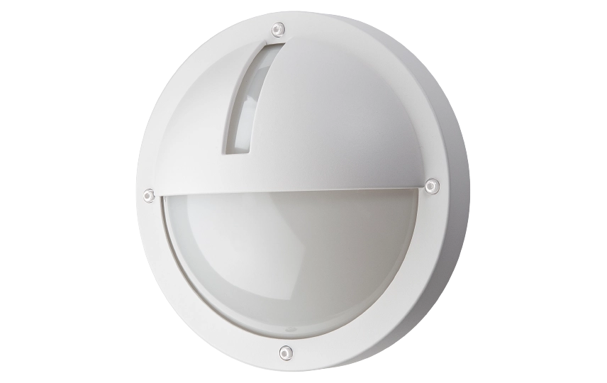 Attractive, round wall luminaire with half-diffuser and slit that can be installed both indoors and outdoors. Made of die-cast powder-coated aluminium. Diffuser made of UV-stabilised opal polycarbonate.Two inputs/outputs for cables, option of both visible and concealed cabling, and loopable quick clips. Variants with integrated Twilight relay. IP65 and vandalresistant rating IK10.