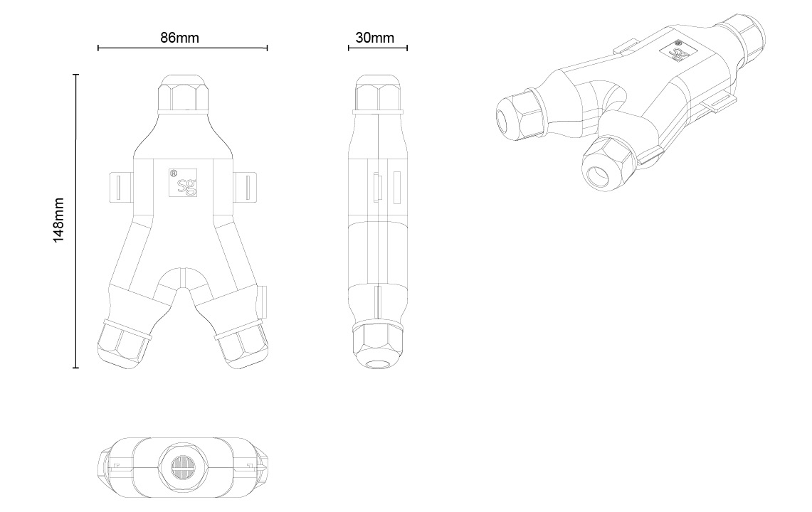 Gelbox-Y Black Connector, Article code: 78741, EAN: 7021987874111, IP68, IK08, Function: Function: The Gelbox contains a connection box with gel, Sg connector for cables 1,5mm2-2,5mm2 and cableglands. , Electrical: Voltage: Max 16A / 250V, Protection: IK Class: IK08, IP Class: IP68, Resistance to Pressure: 4 bar, Materials and finish: Housing: Polyethylene (PE), Colour: Black (RAL 9004), Halogen free: Yes, Mounting/Connection: Mounting: Outdoor, Dimensions: Length (mm) L: 148, Width (mm) W: 86, Height (mm) H: 30, Weight (kg) gross/net: 0.197 / 0.15, Packaging: Packaging dimensions (mm): 135 x 100 x 35