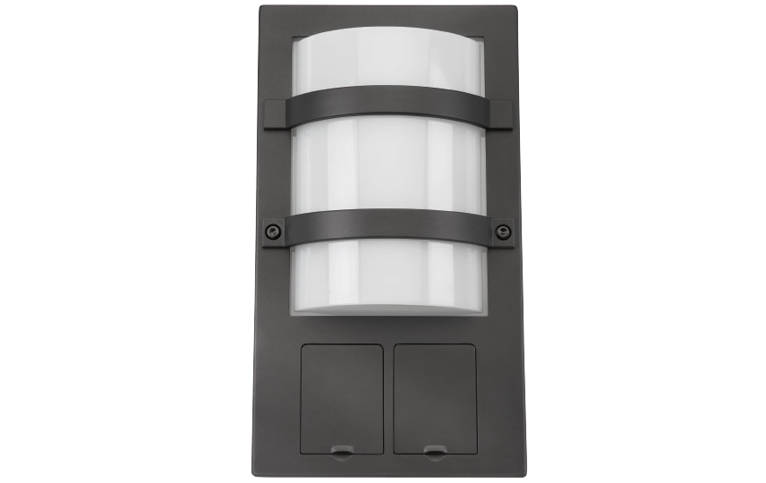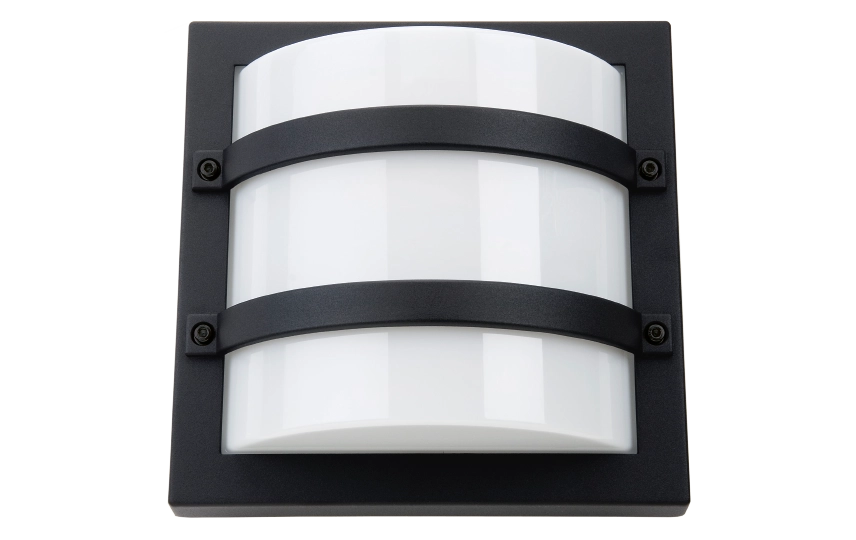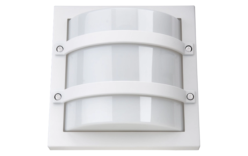 Square wall luminaire with extra protection of diffuser. Made of die-cast powder-coated aluminium. Diffuser made of UV-stabilised opal polycarbonate. Two inputs/outputs for cables, option of both visible and concealed cabling, and loopable quick clips. IP65 and vandal-resistant rating IK10.