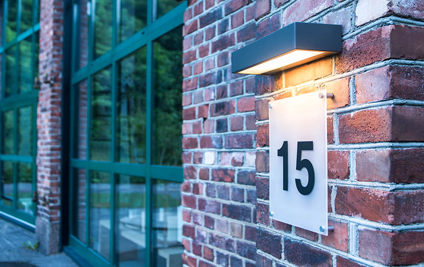 Name and number plate in opal plexiglass for installation under a wall lamp. Available in two different sizes and fits several of SG Lighting’s outdoor luminaires. Installation with the included brackets, which give the sign a floating effect and a more exclusive look.