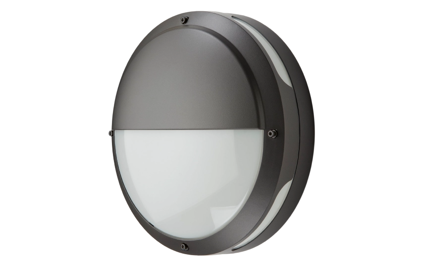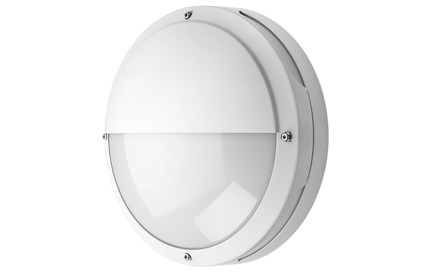 Design: Svein Knudsen / Andrew Smith. Attractive, round wall luminaire with half-diffuser and four slits for indirect light that can be installed both indoors and outdoors. Made of die-cast powder-coated aluminium. Diffuser made of UV-stabilised opal polycarbonate. Two inputs/outputs for cables, option of both visible and concealed cabling, and loopable quick clips. IP65 and vandal-resistant rating IK10.