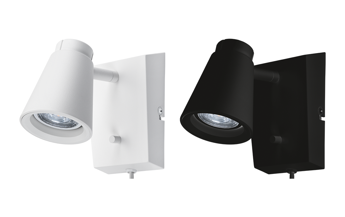 Vegg-/sengelampe med utskiftbar GU10-LED DimToWarm-funksjonalitet samt integrert dimmer og på/av-knapp. Spothodene kan vippes og roteres. Den justerbare skjermen kan endre spredningen av lyset. Perfekt fargegjengivelse ved hjelp av ekstra høy Ra-verdi. Den justerbare skjermen kan endre spredningen av lyset.