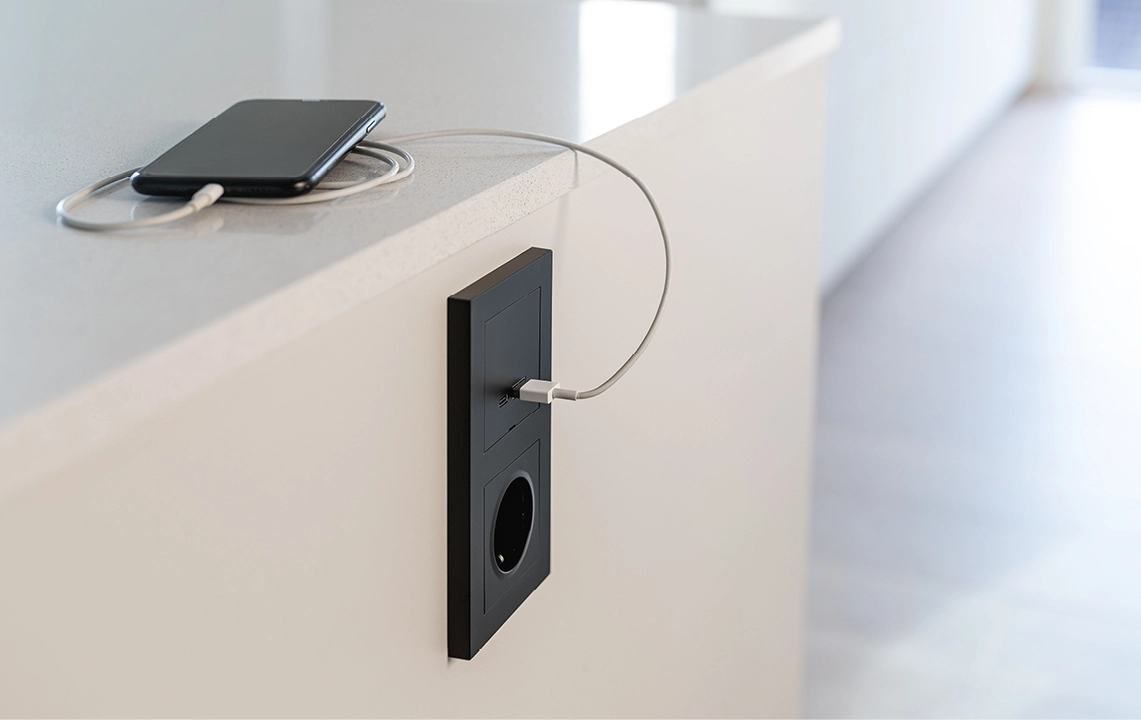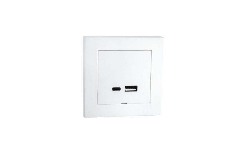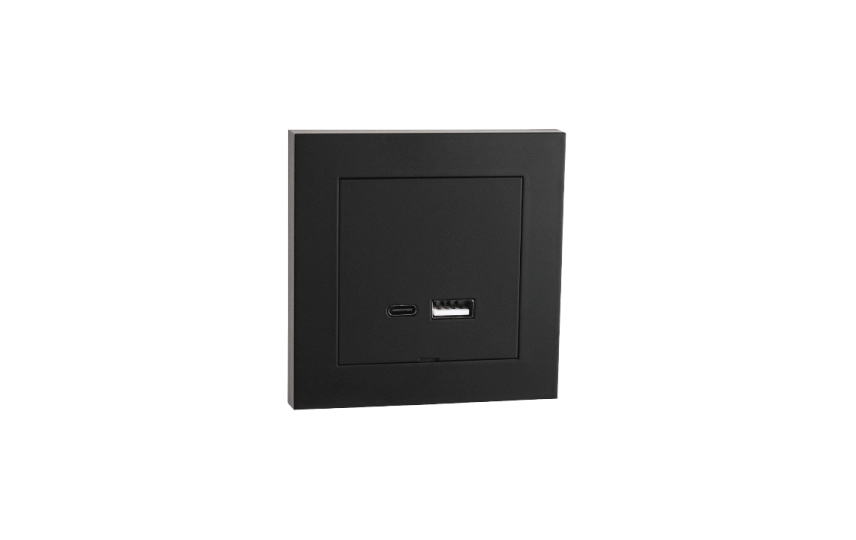 USB lader 3A med 2 uttak (1xUSB A og 1xUSB C). Passer i standard veggboks eller påveggskappe og kan benyttes i rammer sammen med annet innfelt materiell. Laget i halogenfritt polykarbonat som gir økt fargebestandig hvitfarge. Den sorte har gjennomfarget sort materiale som gjør den robust mot skraper og merker.