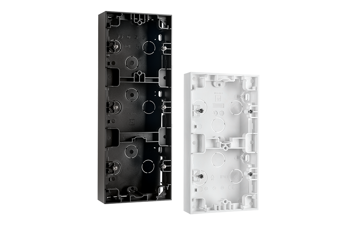 Förhöjningsramar som passar alla infällda produkter. Använd fästramen från strömställaren när du sätter fast brytaren. Enskilda fästramar kan även beställas separat. Förhöjningsramarna är tillverkade av polykarbonat, vilket ger den vita färgen bättre färgbeständighet. Den svarta serien har genomfärgat svart material, vilket gör den motståndskraftig mot repor och märken.