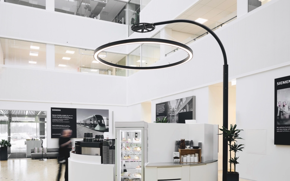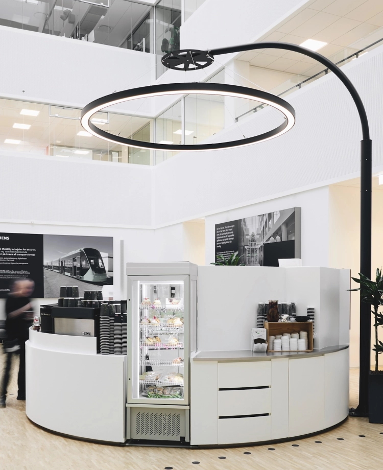 I mitten av en ljus och modern kontorsbyggnad fungerar en rund cafédisk som en naturlig mötesplats för medarbetare och besökare. Området är utformat för att stödja samarbete och kreativitet, men det saknades tillräcklig belysning bakom disken. Samtidigt fanns det begränsade möjligheter att installera traditionella armaturer utan att störa det arkitektoniska uttrycket.
