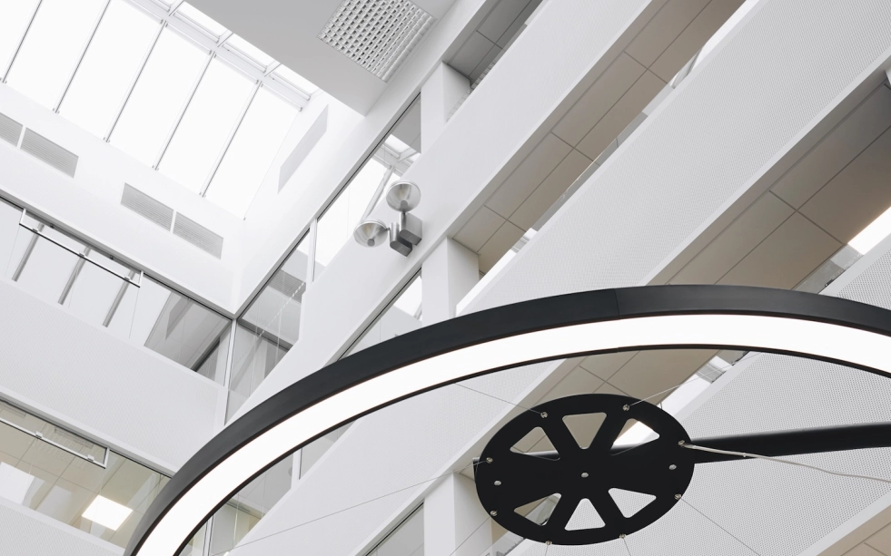 En Ring of Fire-armatur är monterad på masten för att säkerställa en jämn och behaglig belysning av arbetsytan bakom disken. Lösningen integreras på ett naturligt sätt i atriumets design och skapar en harmonisk balans mellan funktion och estetik.