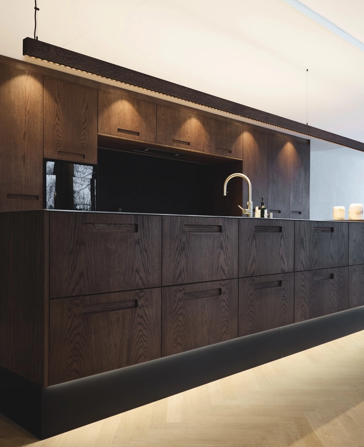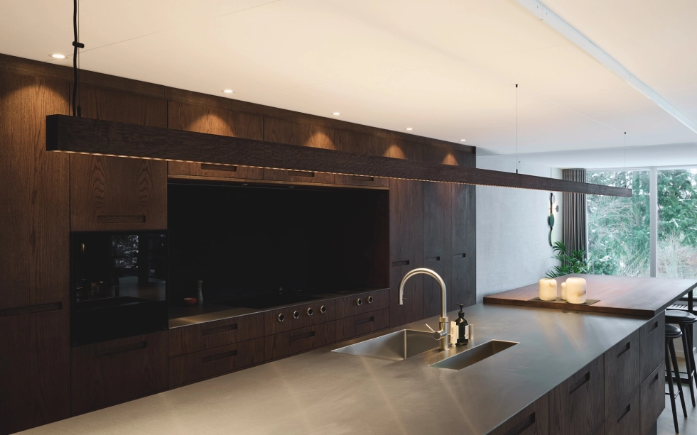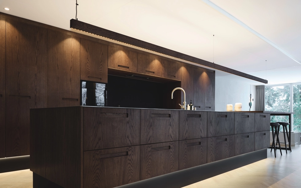 Ovanför den sex meter långa köksön har en specialtillverkad Lineal ekarmatur installerats, oljad i samma färg som köket. Armaturen mäter 5,8 meter och kombinerar uplight och downlight, vilket ger både funktionell arbetsbelysning och behaglig rumsbelysning.