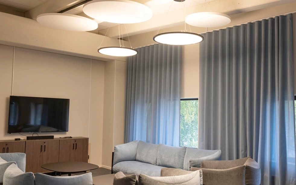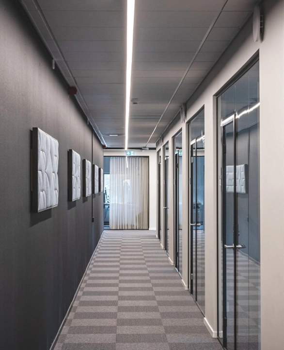 SG Armaturen offererade ett komplett belysningsförslag, som innehöll bland annat spotlights till kontoren samt en slingrande ljuslist i taket på korridorer och till arbetsplatser.