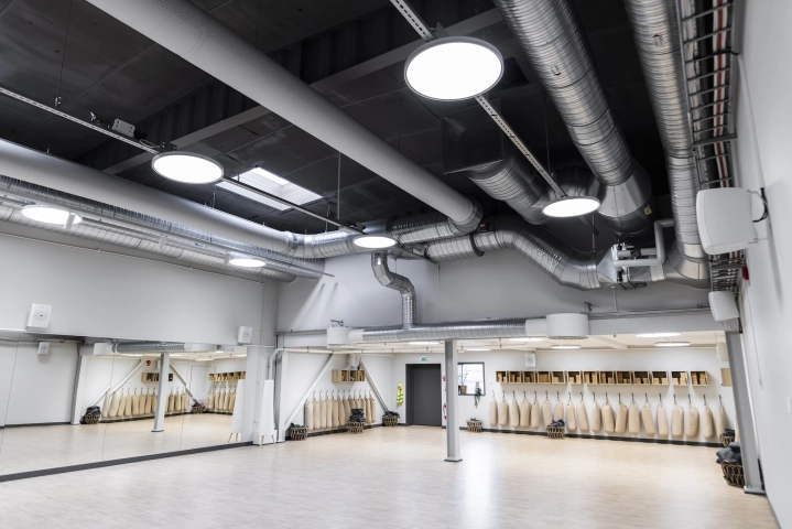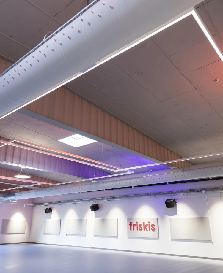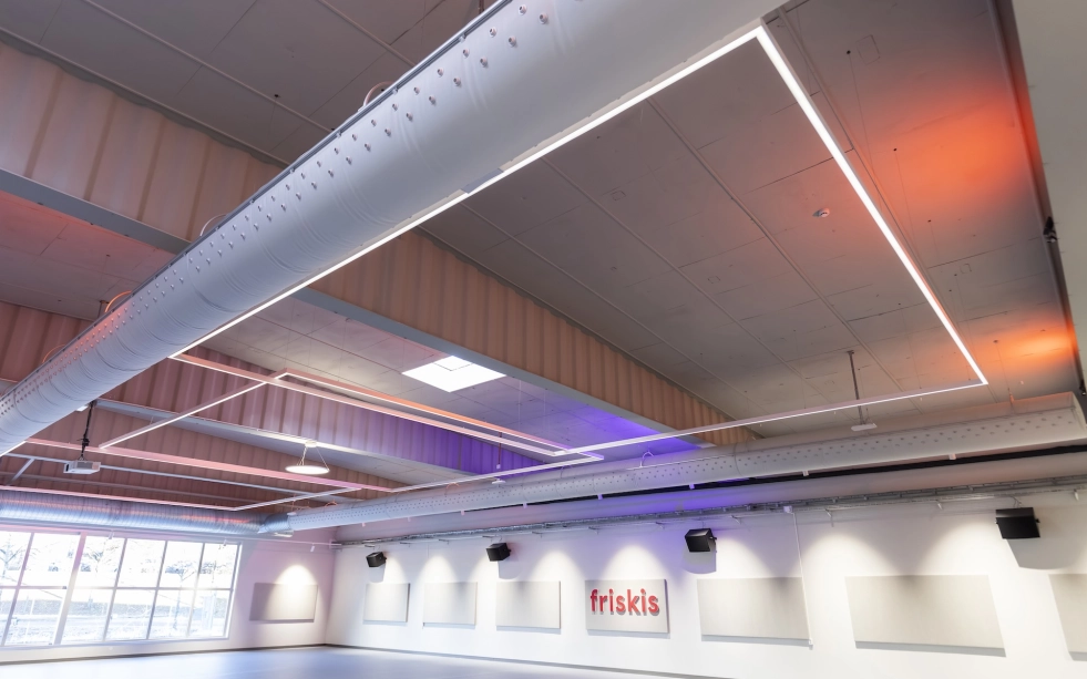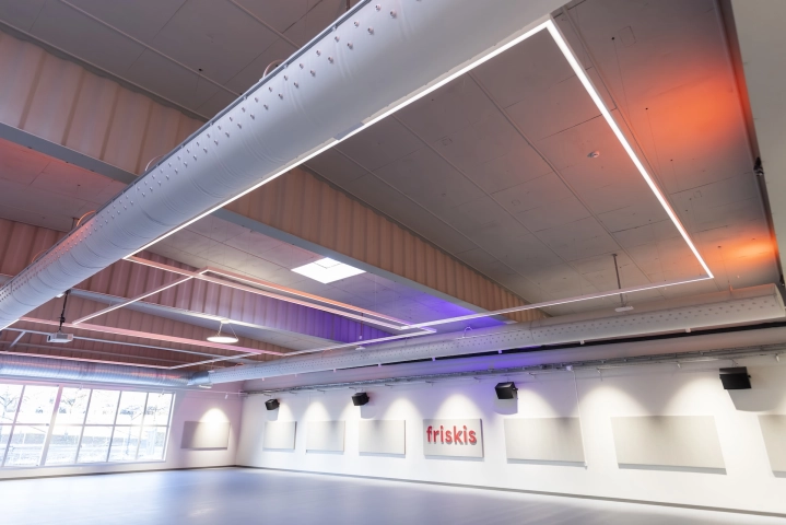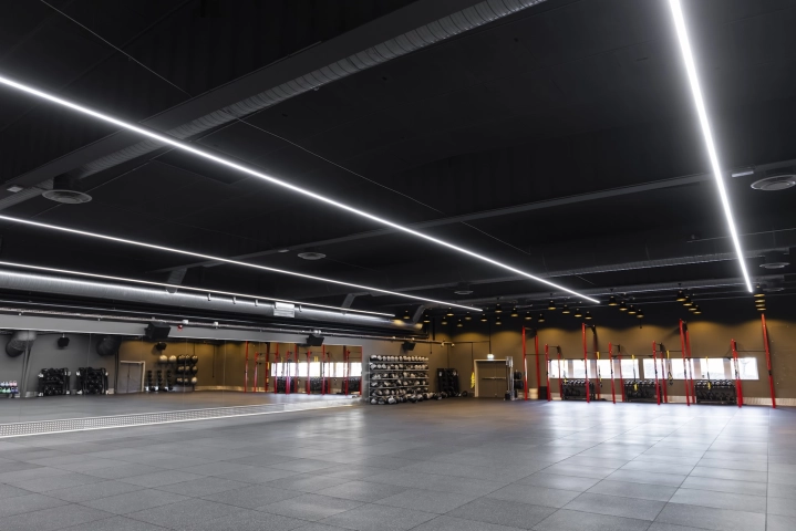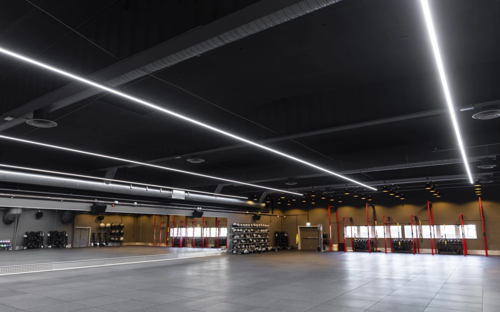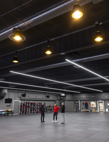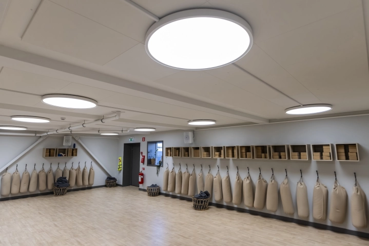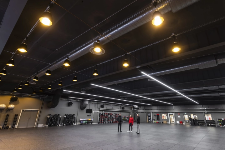 I Stora salen används Ruler-systemet i raka linjer för ett stramare uttryck, kompletterat med Bell-armaturen för att bryta upp linjerna och skapa zoner i rummet. Samtliga hallar är utrustade med DALI-styrning och 4.000 kelvin, vilket ger flexibilitet och möjlighet till olika ljusscener anpassade efter aktivitet och användning. Sammantaget ger detta en omfattande och genomtänkt belysning som förstärker känslan av utrymme, funktion och träningsupplevelse.